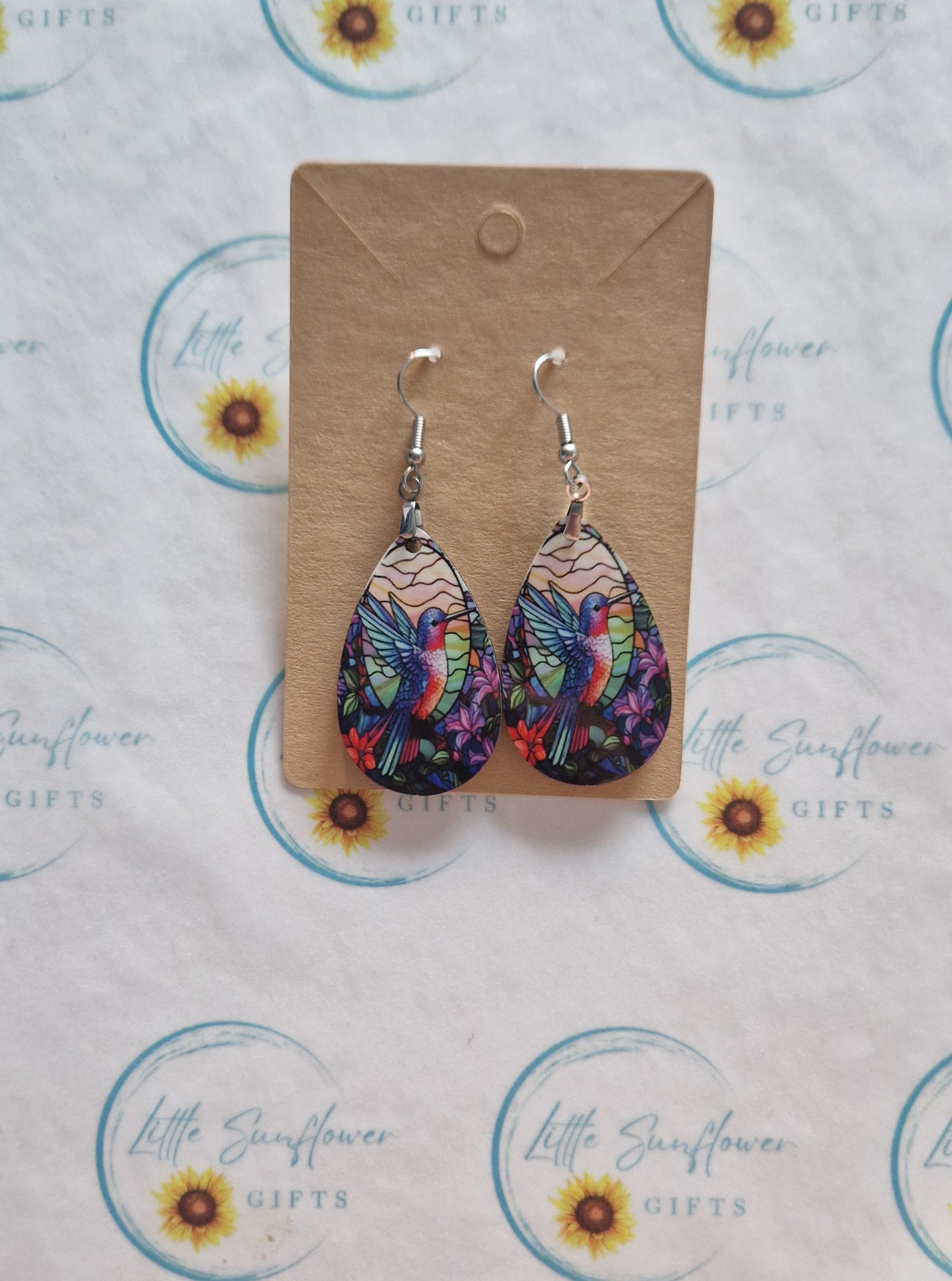 Teardrop mdf wood shape earrings with a stainglass humming bird design finished with stainless steel hooks