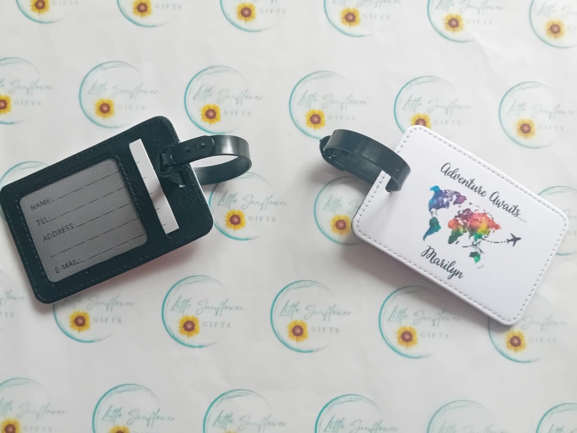 The personalised PU leather luggage tag and linen travel documents pouch combine functionality with style. The durable PU leather tag ensures your luggage is easily identifiable, while the linen pouch, featuring a convenient handle, organises travel essentials. The world map design adds a global touch, appealing to avid travelers.